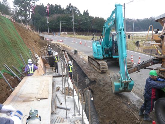 2014年02月 逆台形式擁壁バランス工法擁壁 岩手県千厩土木センター管内でバランス工法擁壁が採用 岩手県千厩土木センター発注の一般県道藤沢大篭線保呂羽地区歩道設置工事においてバランス工法擁壁が採用になりました。歩道幅を確保するために底版幅が狭く用地を最大限利用できるバランス工法擁壁の採用となりました。また擁壁天端から盛土となる形状ですが、安定計算でアウトになるメーカーもある中、しっかりした安定計算を行っています。