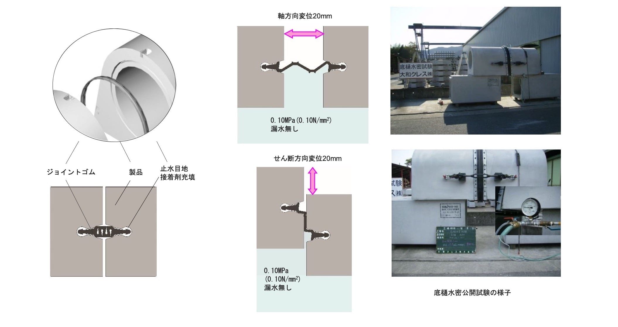- 可とう性(軸方向20mm、せん断方向20mm)と止水性(0.10Mpa(0.10N/m m²)で完全止水)を兼ねた柔結合工法です。
